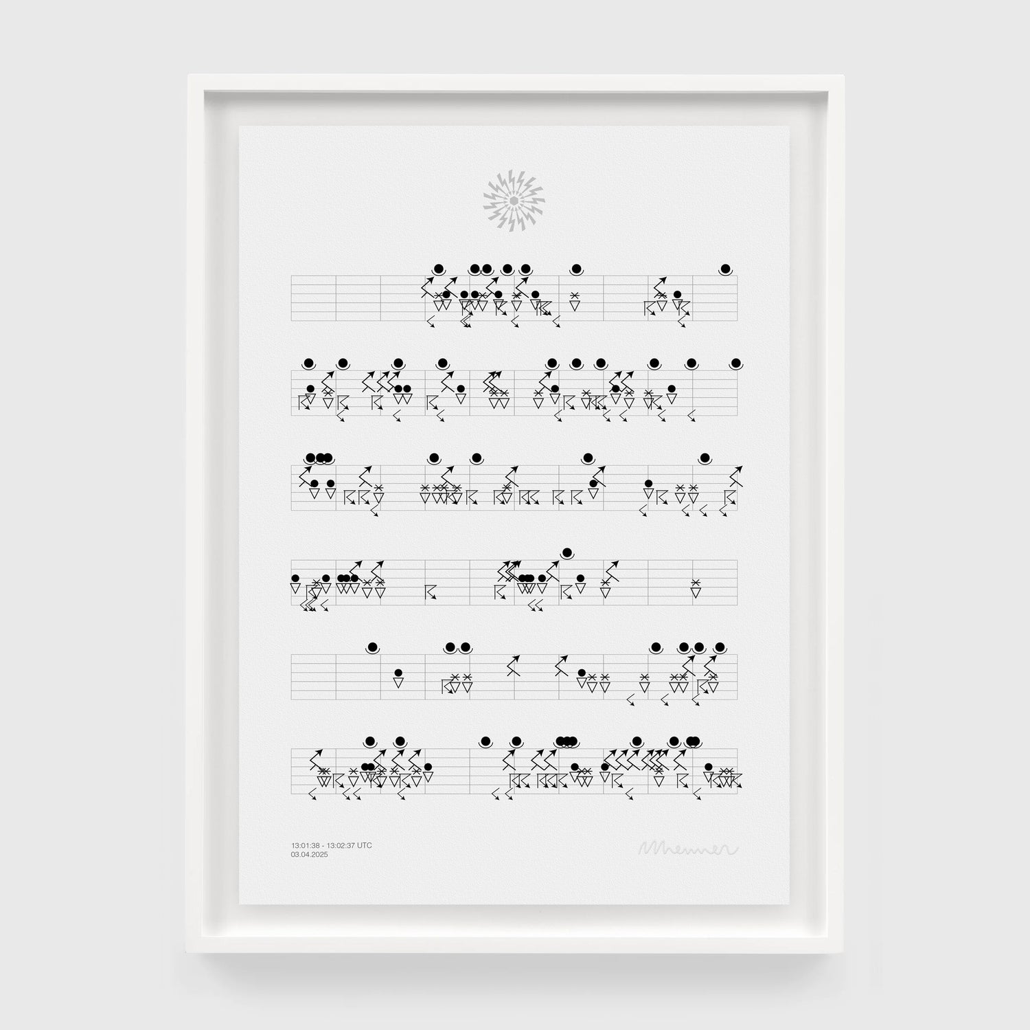 Translating lightning strikes from around the world into a continuous musical score for six percussion instruments. Each print captures a single minute of this global storm — a brief intersection between data, weather, and rhythm.